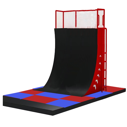 מתחם קפיצות בגבהים שונים, מתחם קפיצות ענק עם רמות גובה, רמפות ואתגרי קפיצה מגוונים.